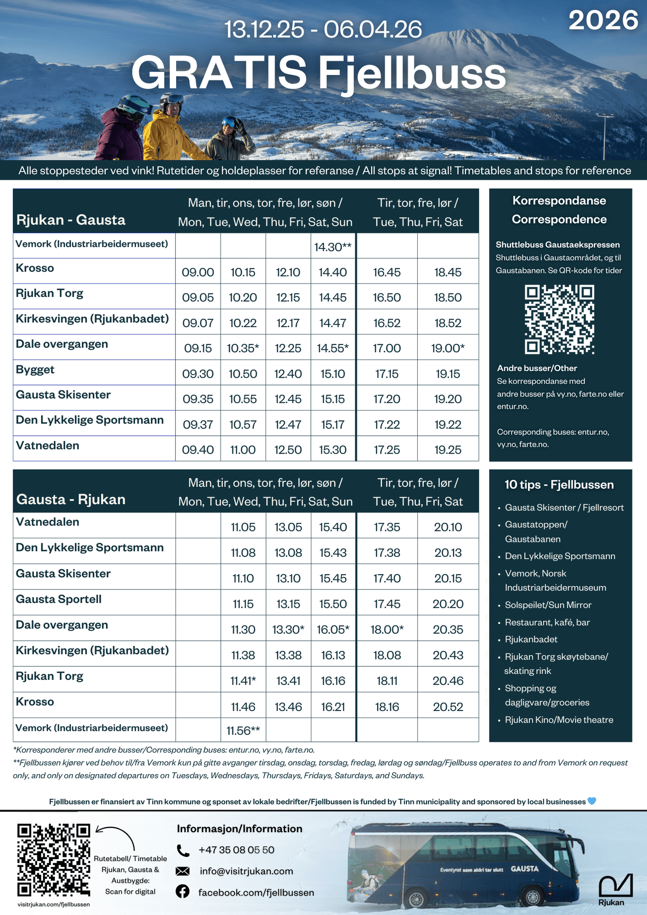 Time Table for Free Fjellbuss between Rjukan & Gausta, December 13th 2025 - April 6th 2026